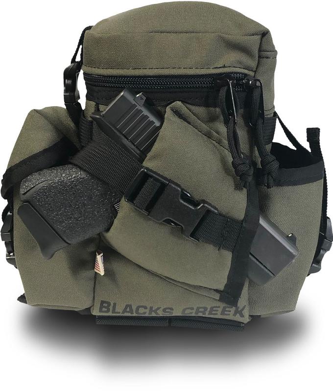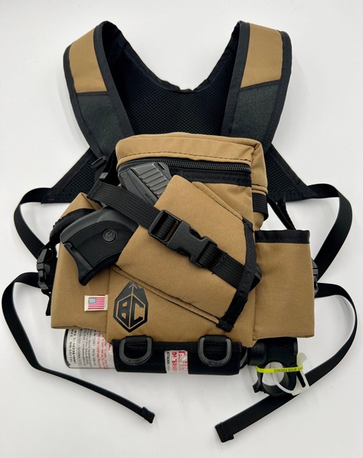 Your wait is OVER! A Bino System that is designed to give you peace of mind, comfort and stability, AND easy access to the items you need most. Compact yet roomy enough to hold your 10x56 or 12x56 binos, range finder, cell phone, license, and YES.. your side arm. The harness’s unique design keeps the carrier tight to your chest and doesn’t crawl up your back. It’s modular design allows the carrier to be unclipped from the harness and attached to your backpack’s shoulder straps.